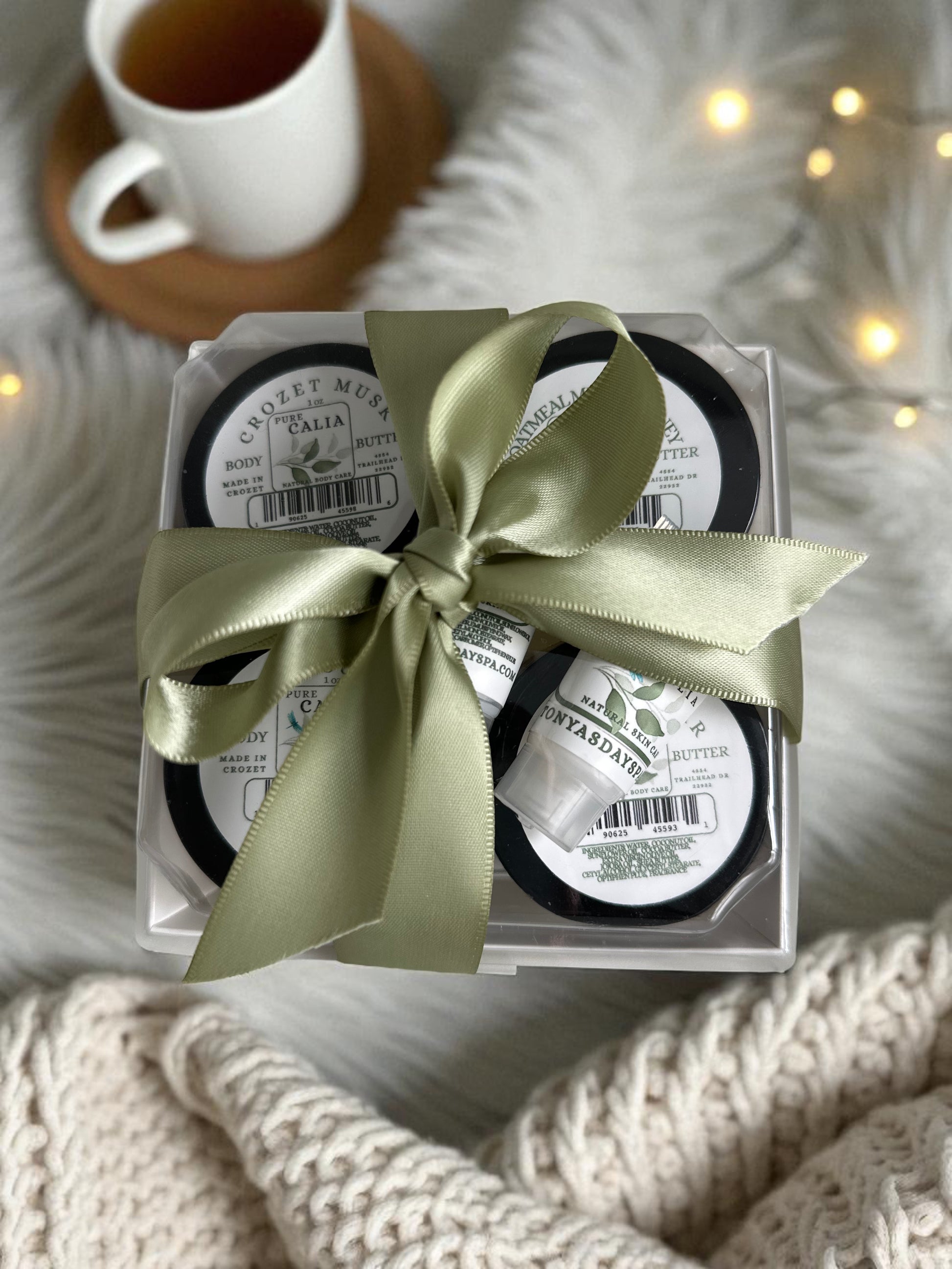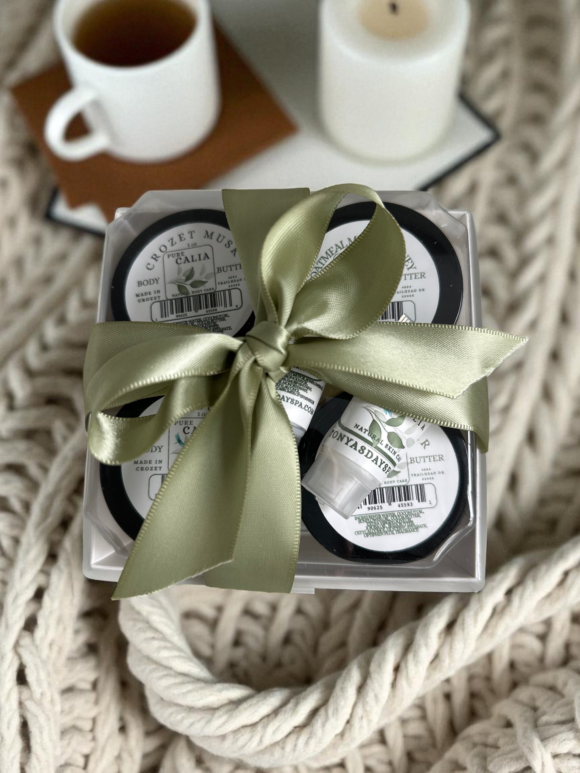 This set features Four delightful 1 oz body butters in Crozet Musk, Oatmeal Milk & Honey, Pink Sugar, French Pear. Each scent wraps your skin in rich, nourishing moisture while adding a touch of fun and whimsy to your daily routine. Perfect for gifting or treating yourself to a fragrant escape!